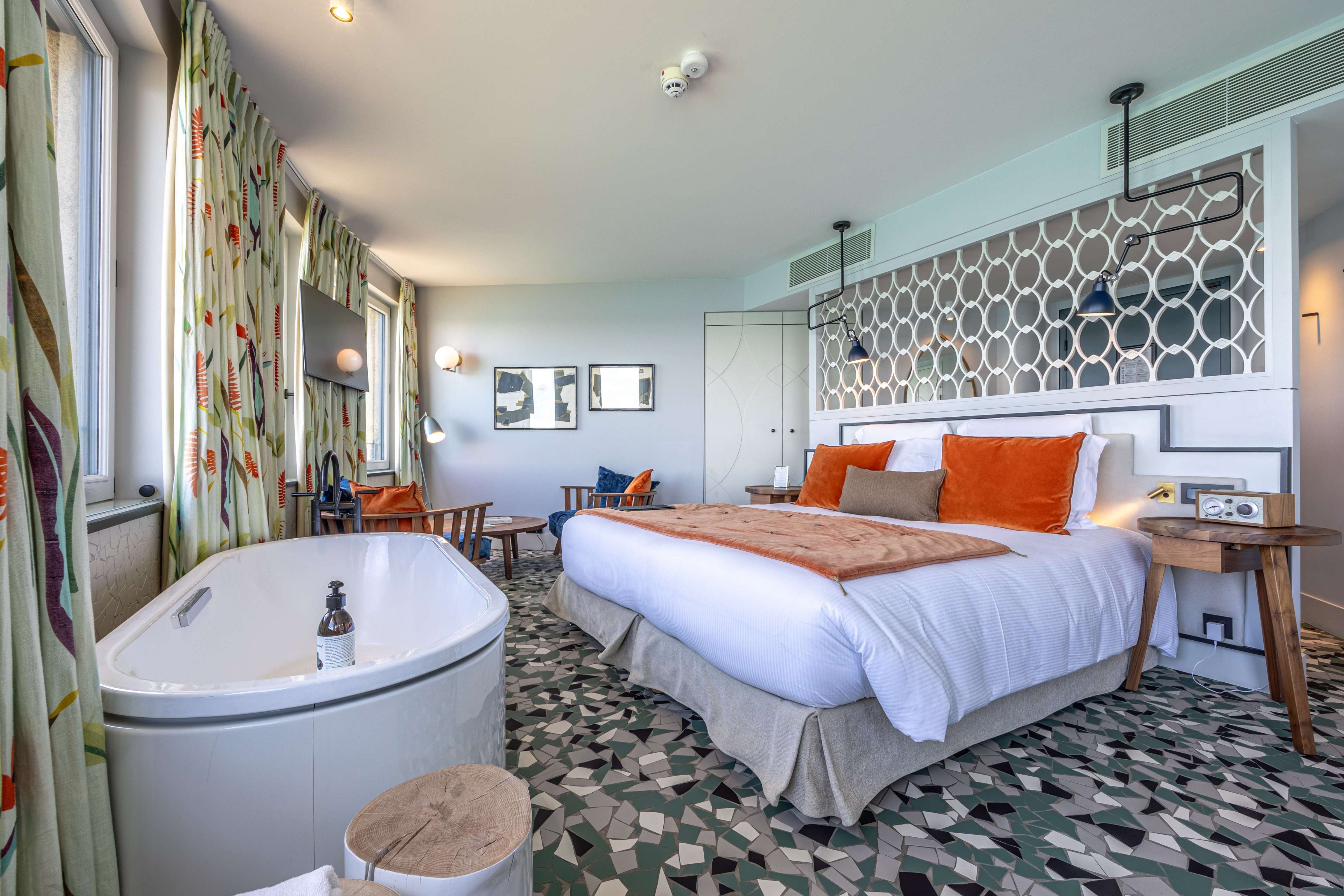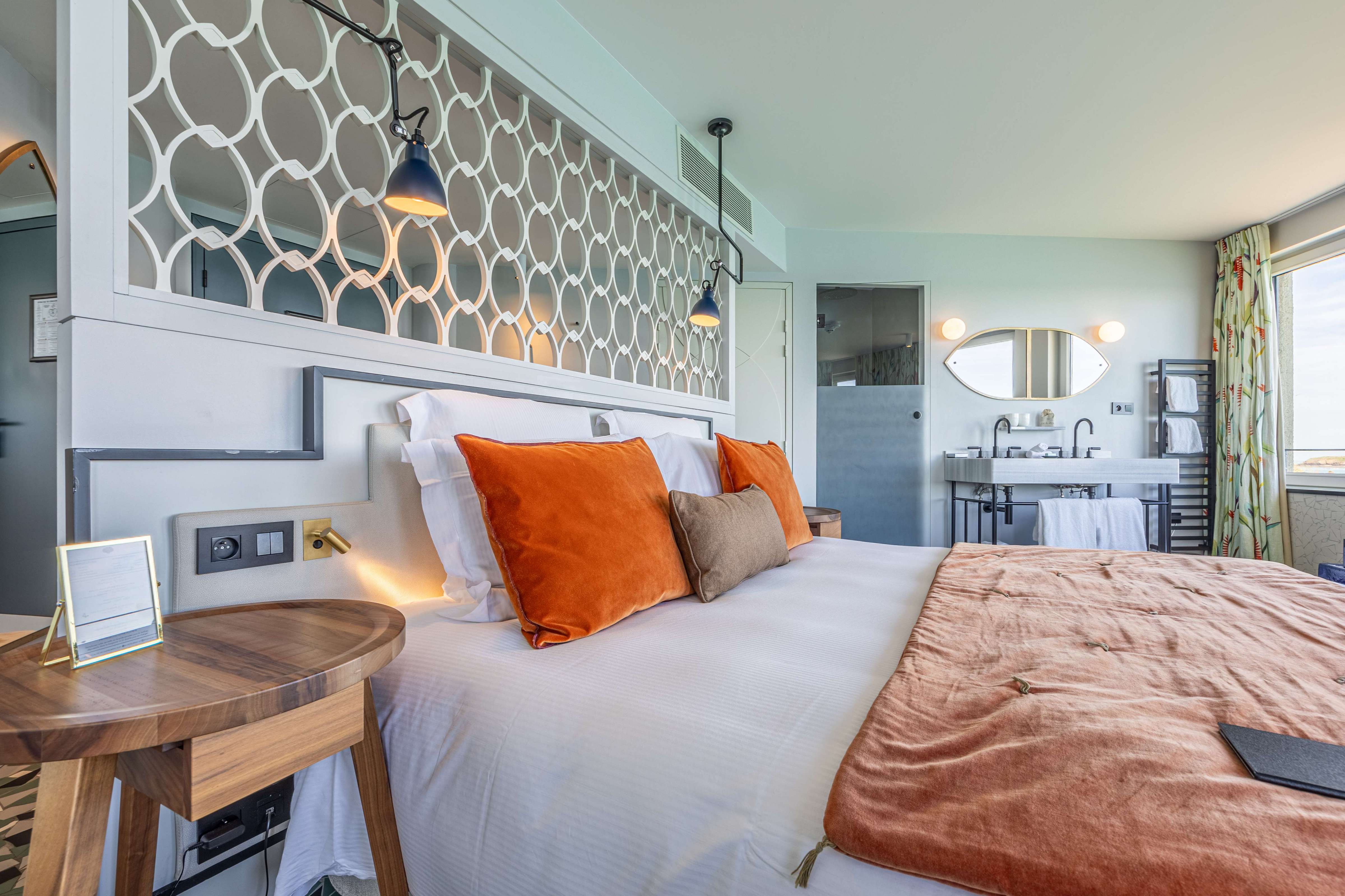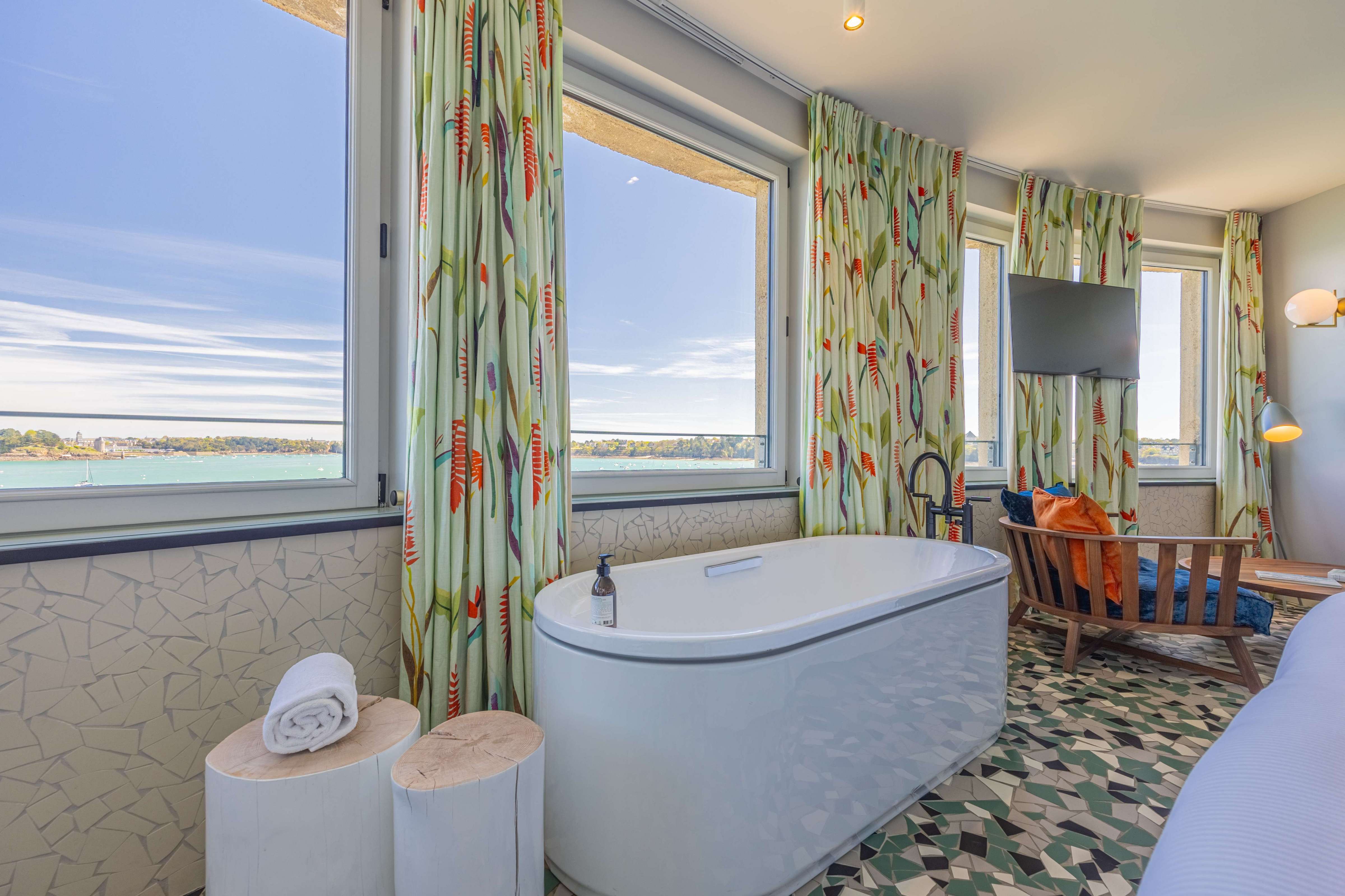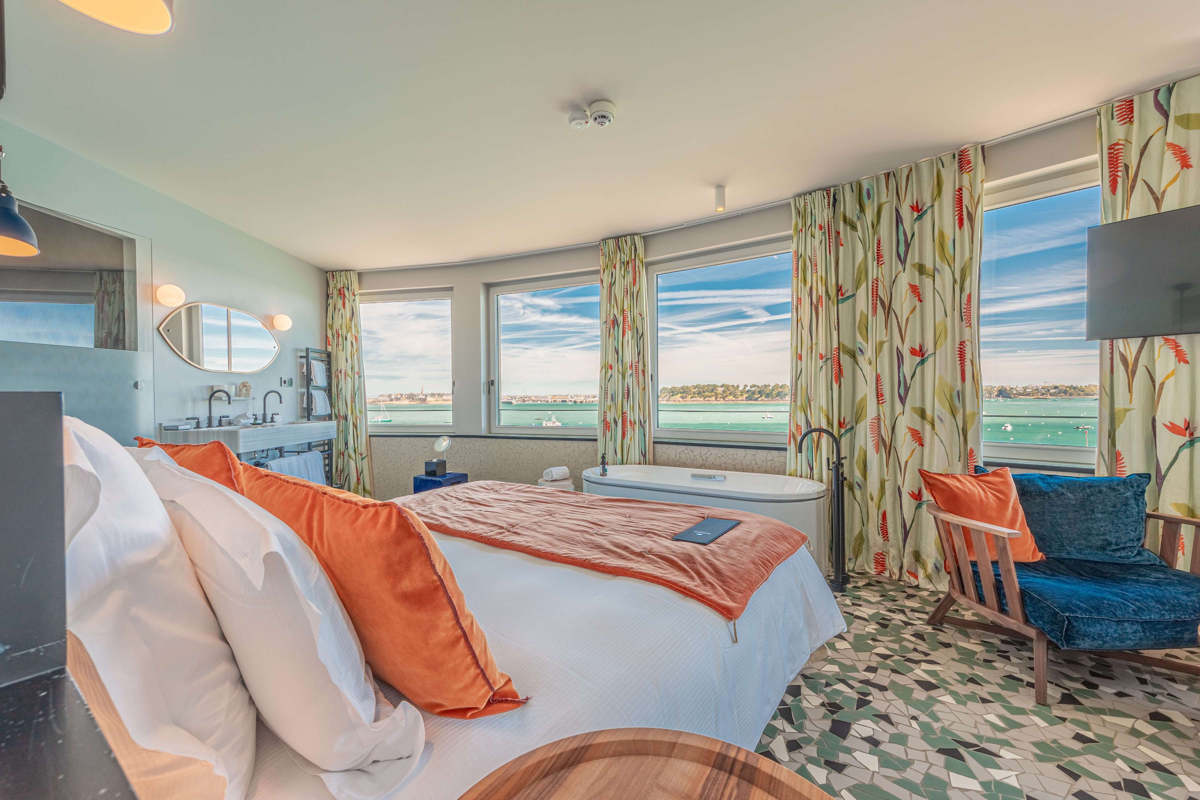 Our Prestige sea view rooms are particularly spacious and include a sitting area. Elegant and warm, they offer a direct view of the sea. They have a large wardrobe, a bathroom equipped with a bathtub and/or a spacious walk-in shower. Treat yourself to the comfort of these luxurious rooms with their colourful decor.